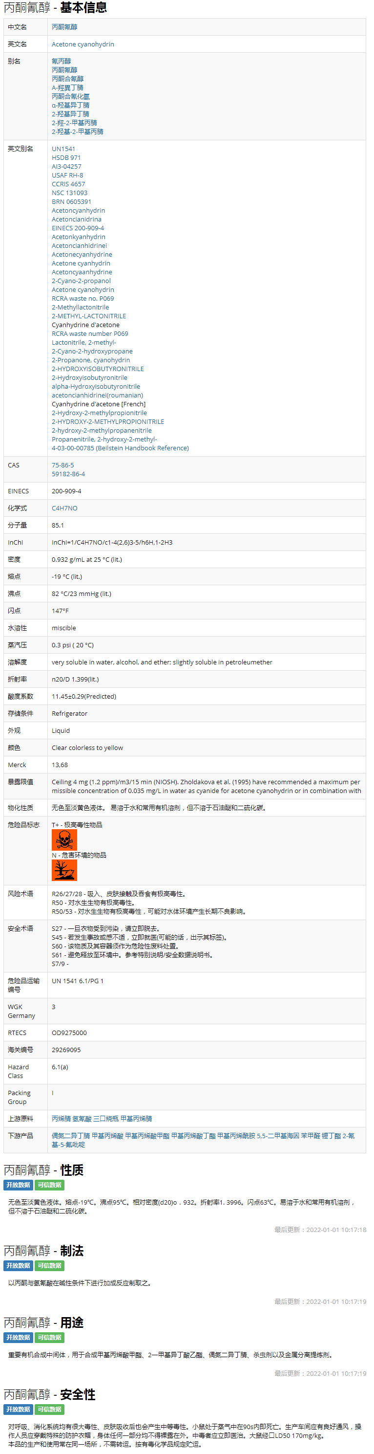 別 名:2-羥基異丁腈;氰丙醇;丙酮氰醇;2-甲基-2-羥基丙腈;2-甲基乳腈;2-羥基-2-甲基丙腈;α-羥基異丁 腈;丙酮合氰化氫